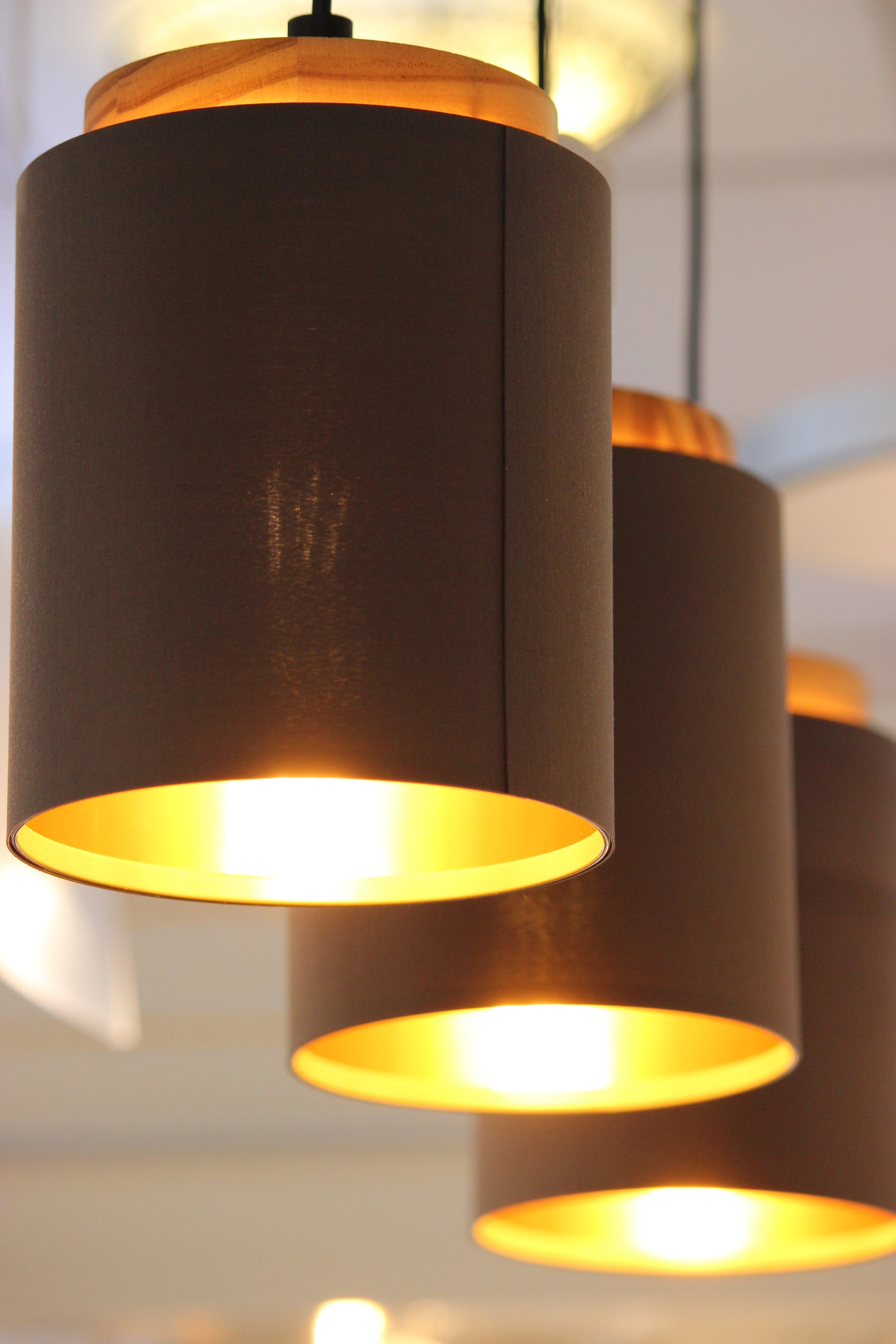 The ALBARIZA pendant light features three cylindrical fabric lampshades in cappuccino with a gold-colored inner finish. Paired with the black metal ceiling mount, the natural wood elements at the top of the lights create a homely appeal. The hanging lamp is a lovely addition to any modern interior and the perfect lighting solution for the dining room, especially above a long dining table. The product requires 3 x E27 lightbulbs which are not included.